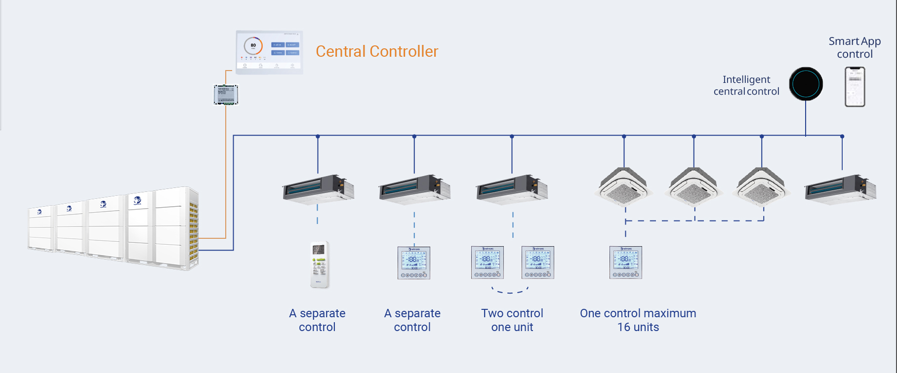 Anschluss von bis zu 16 Systemen und 1280 Innengeräten möglich, einfache Parametrierung der Innengeräte