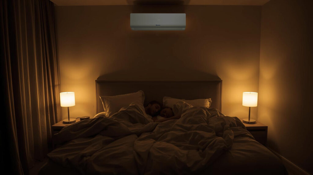 Die Nachtmodus-Funktion schafft die ideale Umgebung für erholsamen Schlaf, indem sie die Temperatur automatisch stündlich um 1–2 °C anpasst. Diese schrittweise Veränderung folgt dem natürlichen Schlafrhythmus des Körpers und verhindert, dass der Raum nachts zu kalt oder zu warm wird. Das System hält das Raumklima stabil und angenehm, sodass Sie leichter einschlafen und tiefer, ungestört schlafen können. Durch die Optimierung von Temperatur und Geräuschpegel sorgt der Nachtmodus zudem für einen energieeffizienten Betrieb und einen erfrischten Start in den Tag.