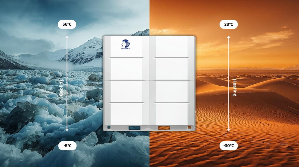 NØRDIS VRF-Systeme sind für effiziente Leistung in extremen Klimazonen ausgelegt – von –30 °C bis +56 °C – und gewährleisten zuverlässiges Kühlen und Heizen das ganze Jahr über, unabhängig von Jahreszeit oder Umgebungsbedingungen.